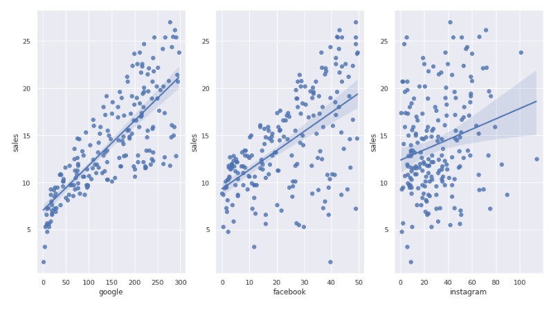 For the exploratory data analysis (EDA), a scatterplot with a regression line has been created using seaborn.regplot in Python to show the linear relationship between sales and each of the social media ads platform.